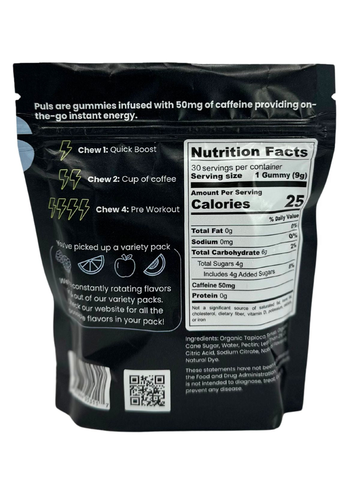 Puls Gummies are bite-sized energy supplements that contain 50mg of caffeine per gummy—about the same as a small cup of coffee. They’re designed for people who want a convenient, portable way to get a clean caffeine boost without the hassle of brewing or chugging.